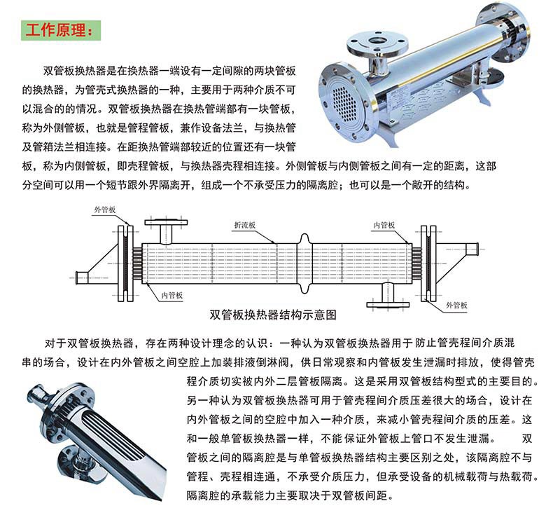 換熱器在各個領(lǐng)域應(yīng)用十分廣泛,是不可缺少的工藝設(shè)備之一,但在實際操作中換熱器的換熱管與管板連接處容易發(fā)生泄漏,使管程物料和殼程物料有少許的混合。在有些場合,少許的泄漏是允許的;而有些場合管程物料和殼程物料想混后會產(chǎn)生嚴(yán)重的后果。雙管板換熱器結(jié)構(gòu)由于具有能確保管殼程介質(zhì)完全分隔開、不能互相串通,無論管殼程哪段介質(zhì)泄漏即可迅速檢測出等優(yōu)點,越來越受到介質(zhì)有高度危害且管殼程介質(zhì)嚴(yán)格不能互相混合的用戶的歡迎。